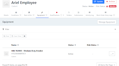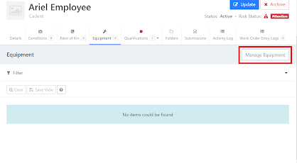 You may see any equipment that is already assigned to the employee on this page, for this example there is none. Now click Manage Equipment.