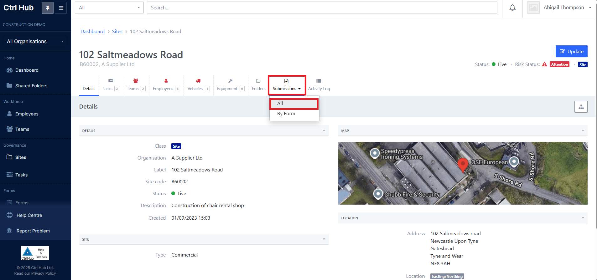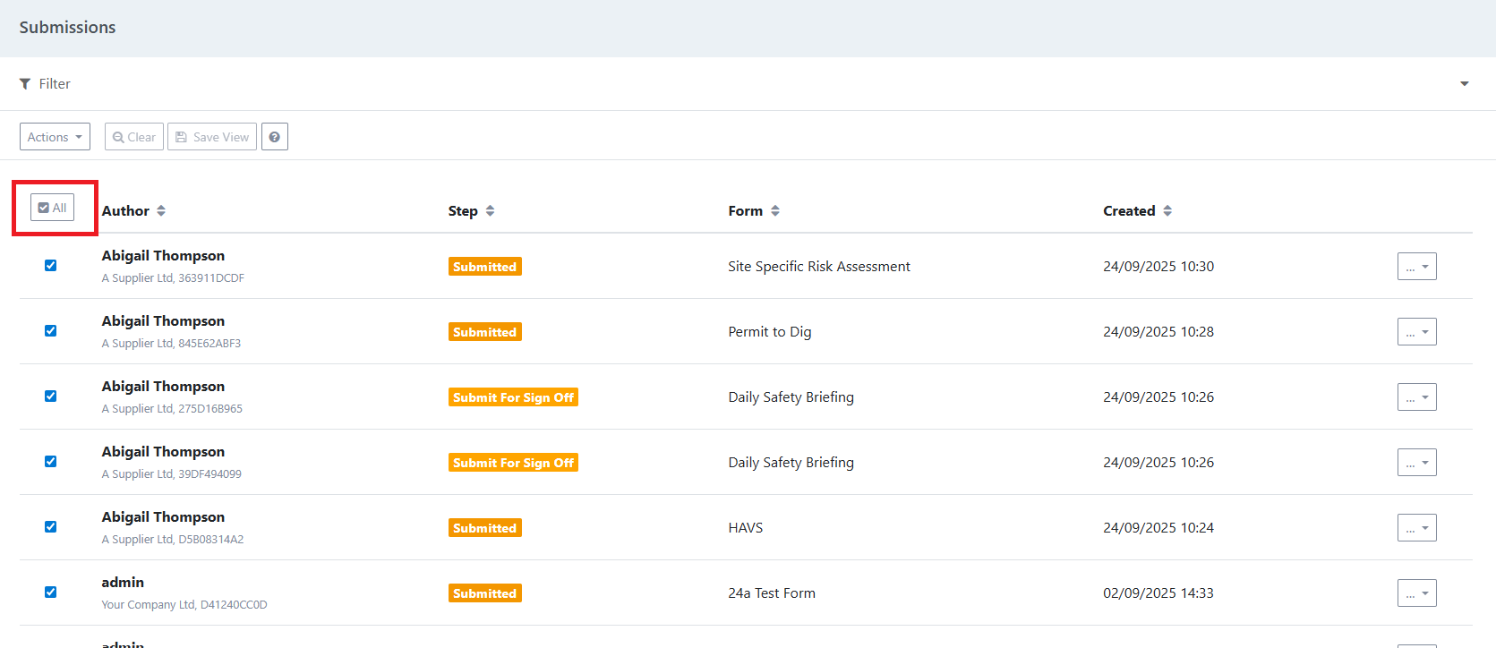 You can action this in form submissions or any areas in the platform where there are associated submissions, such as employees, sites, tasks, equipment, and vehicles.