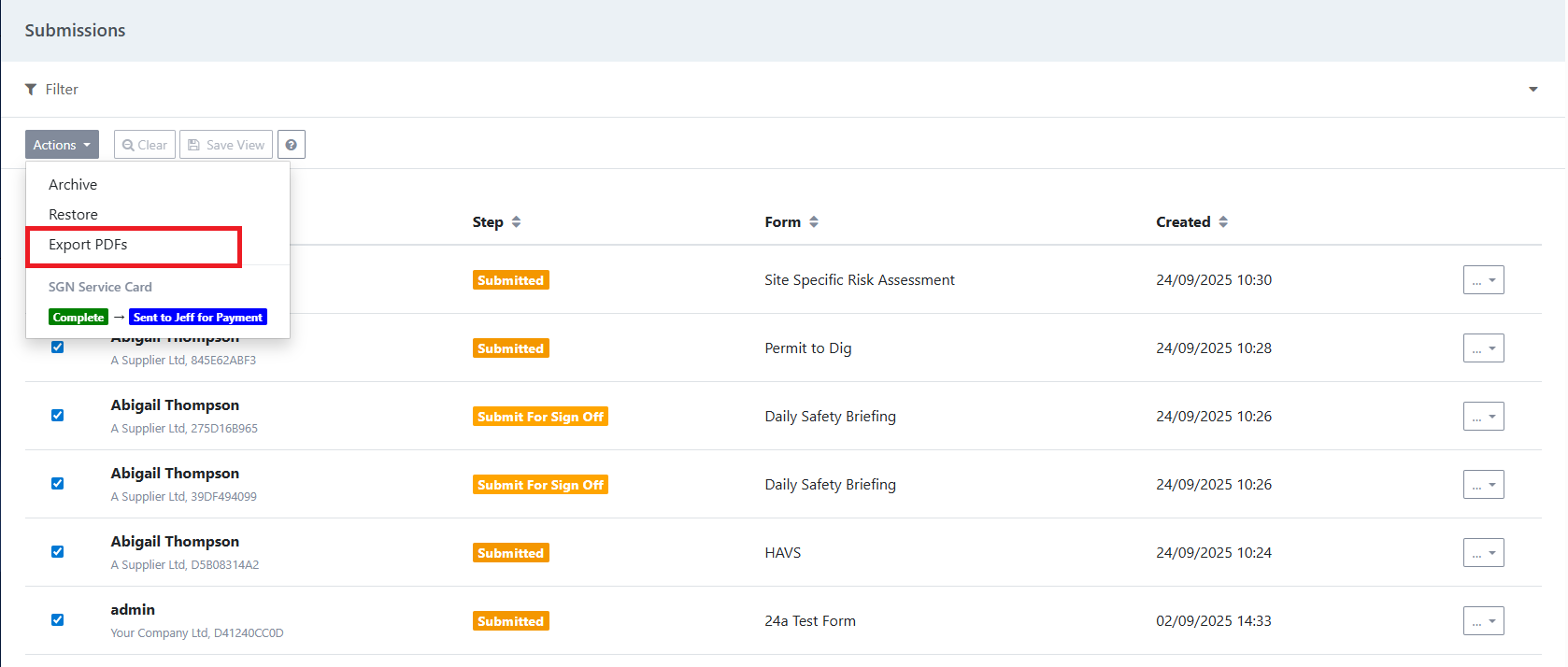 Once the list of submissions appear, tick the boxes that you requires PDFs for, go to Actions and select Export PDFs.